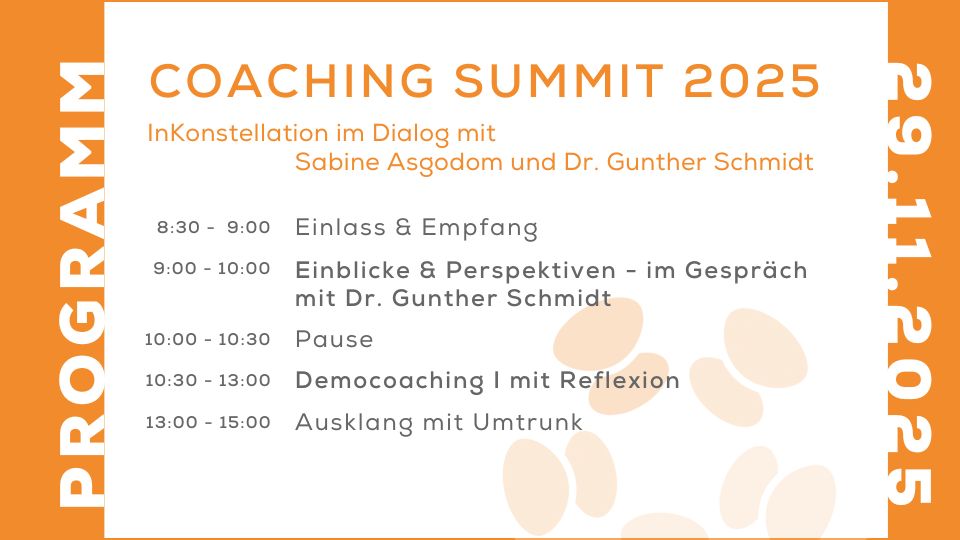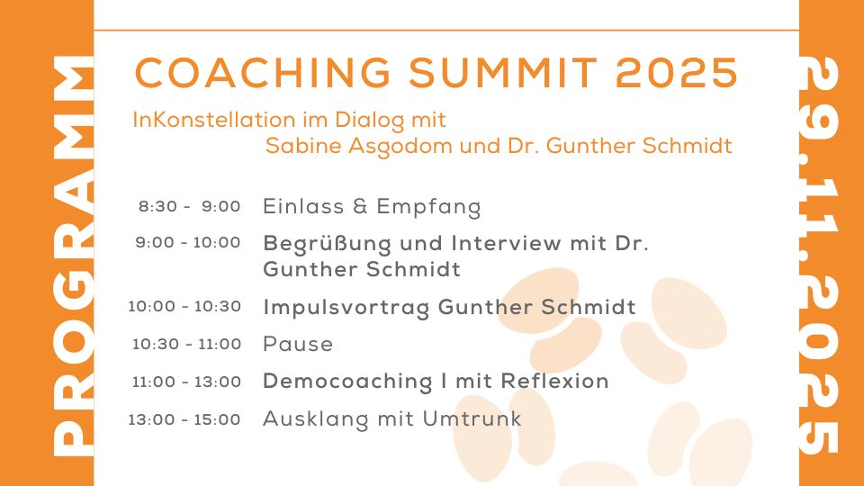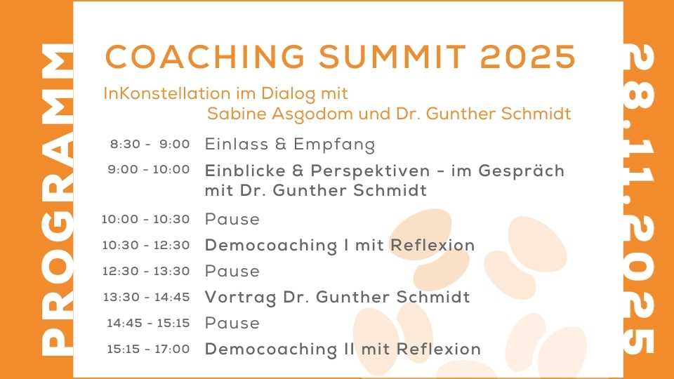 Im Mittelpunkt stehen zwei Ausnahmepersönlichkeiten des deutschsprachigen Coachings: Dr. Gunther Schmidt und Sabine Asgodom – live auf einer Bühne, im direkten Kontakt mit Ihnen.