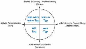 Die horizontale Achse in nachstehender Abbildung beschreibt hingegen, wie wir das zuvor Wahrgenommene verarbeiten, entweder zuerst durch direktes Ausprobieren neuer Dinge oder durch zuschauen und reflektieren, bevor dies aktiv umgesetzt wird.