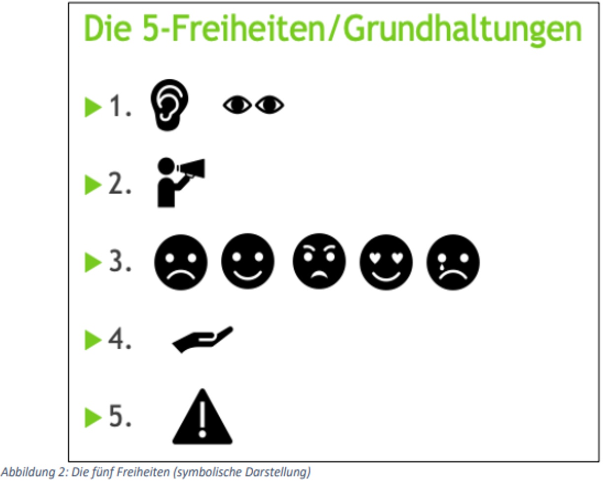Für die fünf Freiheiten ist eine Kommunikation erforderlich, die einschließt, wie man sich selbst fühlt, wie man sich in Beziehung zu anderen Menschen und der auftretenden Situation fühlt.
