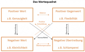 Die Grundannahme des Wertequadratsist, dass jedes Persönlichkeitsmerkmal aufgrund von Grundwerten und Einstellungen des Bewertenden sowohl negativ als auch positiv bewertet werden kann.