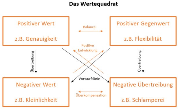 Daher werden im Wertequadrat die Werte aus unterschiedlichen Perspektiven betrachtet. Dazu wird von einem Wert, der positive Gegenwert, als auch dessen jeweilige negative Übertreibung gebildet (vgl. Abbildung 1).