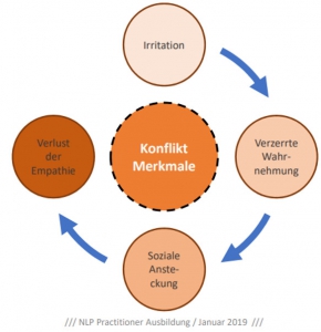 Ein Konflikt entwickelt sich häufig aus einer Irritation heraus. Die aus der Irritation folgende eingeschränkte und verzerrte Wahrnehmung sowie die ständige Verstärkung durch die soziale Ansteckung und dem zunehmenden Verlust von Empathie eskaliert zu einem Konflikt.