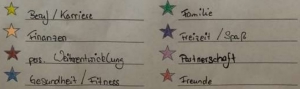 Im nächsten Schritt werden die einzelnen Bereiche nochmal angeschaut und der Klient soll seine eigene Erwartung für den jeweiligen Bereich festlegen und einzeichnen. Nicht jeder Bereich muss/ kann eine 10 erreichen. Hier sind die Erwartungen des Klienten entscheidend bzw.