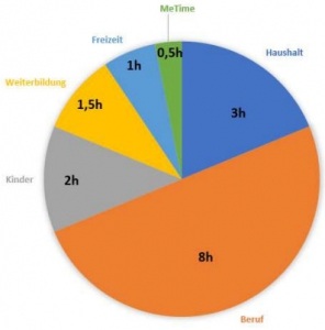 Als erstes wird mit dem Klienten eine Liste erstellt, wieviel Stunden er pro Tag für was verwendet. Dann werden diese Stunden anteilsmäßig in den Kreis eingezeichnet. In unserem Bespiel haben wir 16 Stunden insgesamt (8 Stunden Schlaf haben wir hier nicht eingezeichnet – das kann aber individuell gemacht werden). Wenn man insgesamt 24h hat, also den Schlaf mitzählt, kann man sich an der Einteilung der Uhr orientieren. Verschiedene Farben können auch hier helfen, das Ganze übersichtlicher zu gestalten.