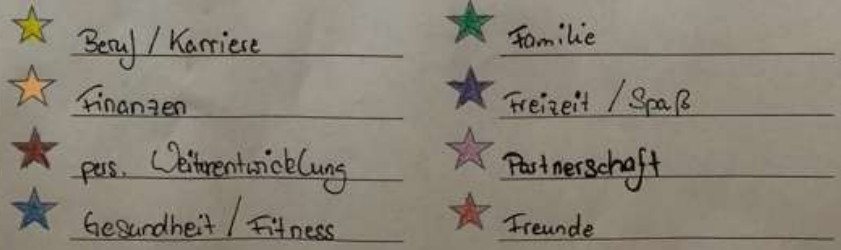 Als erstes müssen die (Lebens-) Bereiche festgelegt werden, die man sich anschauen möchte. Welche Bereiche sind dem Klienten wichtig? Welche Bereiche müssen integriert werden? Hier ist den Ideen keine Grenzen gesetzt.